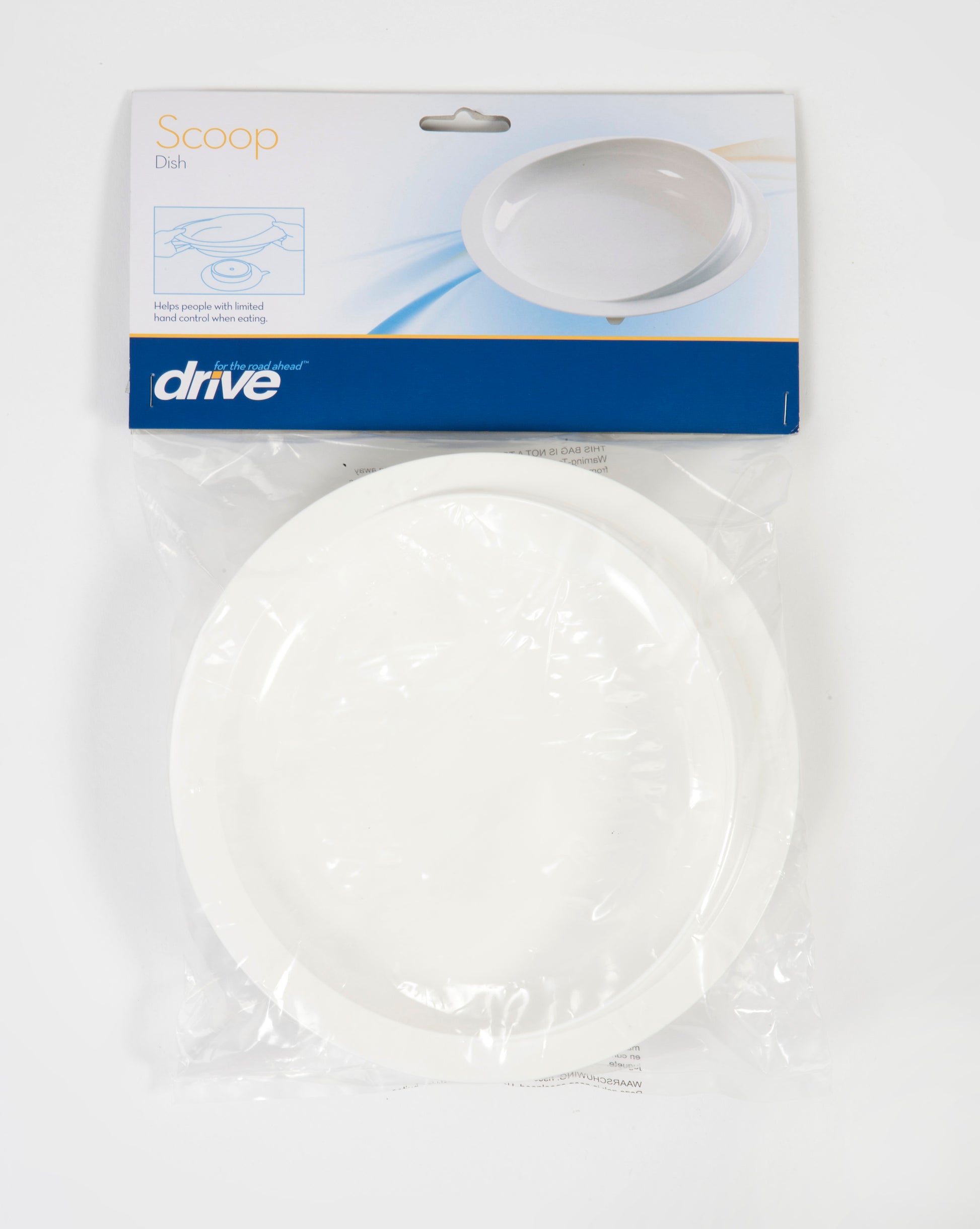 The Scoop Dish has a high rim with a reverse curve on one side that helps the user to scoop food onto a spoon or fork without spilling over the side. Useful for those eating with just one hand. Non-slip, rubber padded bottom. Helpful for people with limited hand control. Microwave and dishwasher safe.