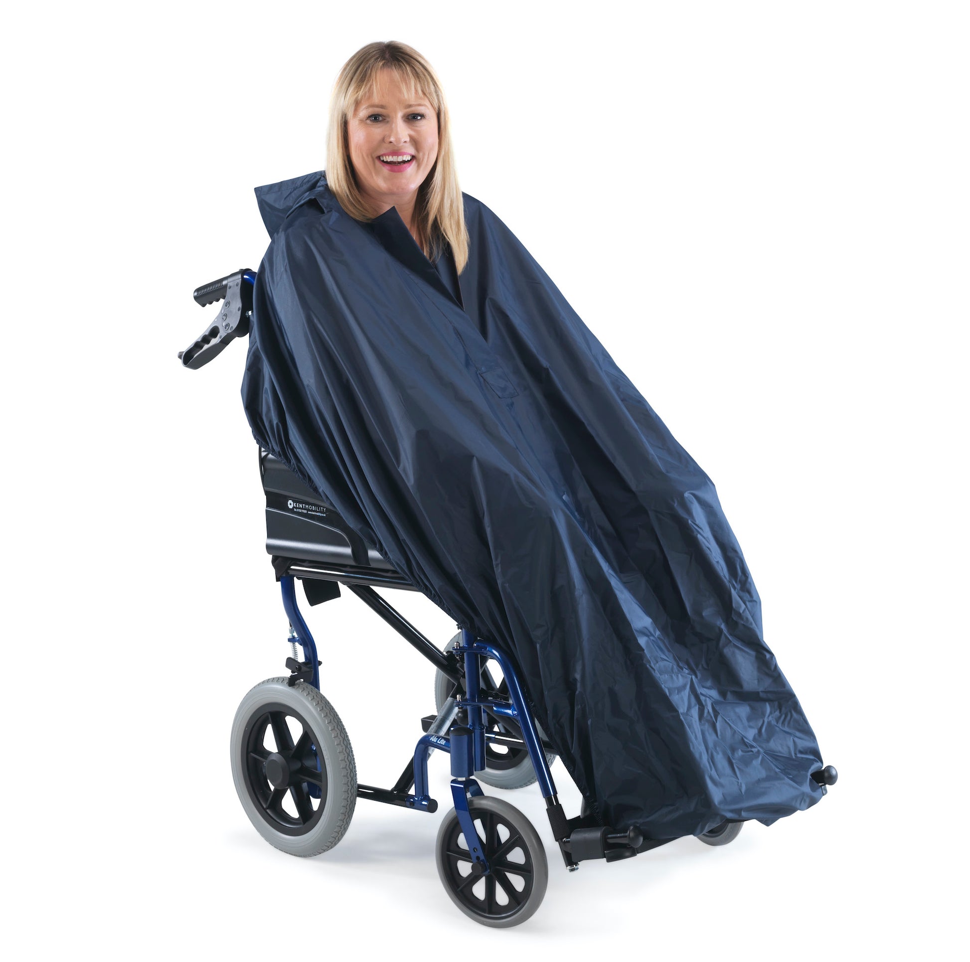 Designed uniquely for scooters and wheelchairs with comfort and versatility in mind. Lined or unlined. Sleeves or sleeveless. Easy to use zips with ring pulls and hook and loop fastenings. Windproof elastic cuffs and plackets. Efficient reflective strips sealed waterproof seams. All our garments provide freedom of movement improvising user health and wellbeing. Easy to put on and take off with half-length zip and can be folded into a compact size for easy storage. To the back of the Mac are placket covered vents allowing easy access to the wheelchairs pushing handles. Elasticated sides helps to ensure a snug fit, keeps draughts to a minimum and prevents it from catching the wheels. Elasticated all the way around to ensure a snug fit. A placket covered outer pouch pocket. Waterproof sealed seems.